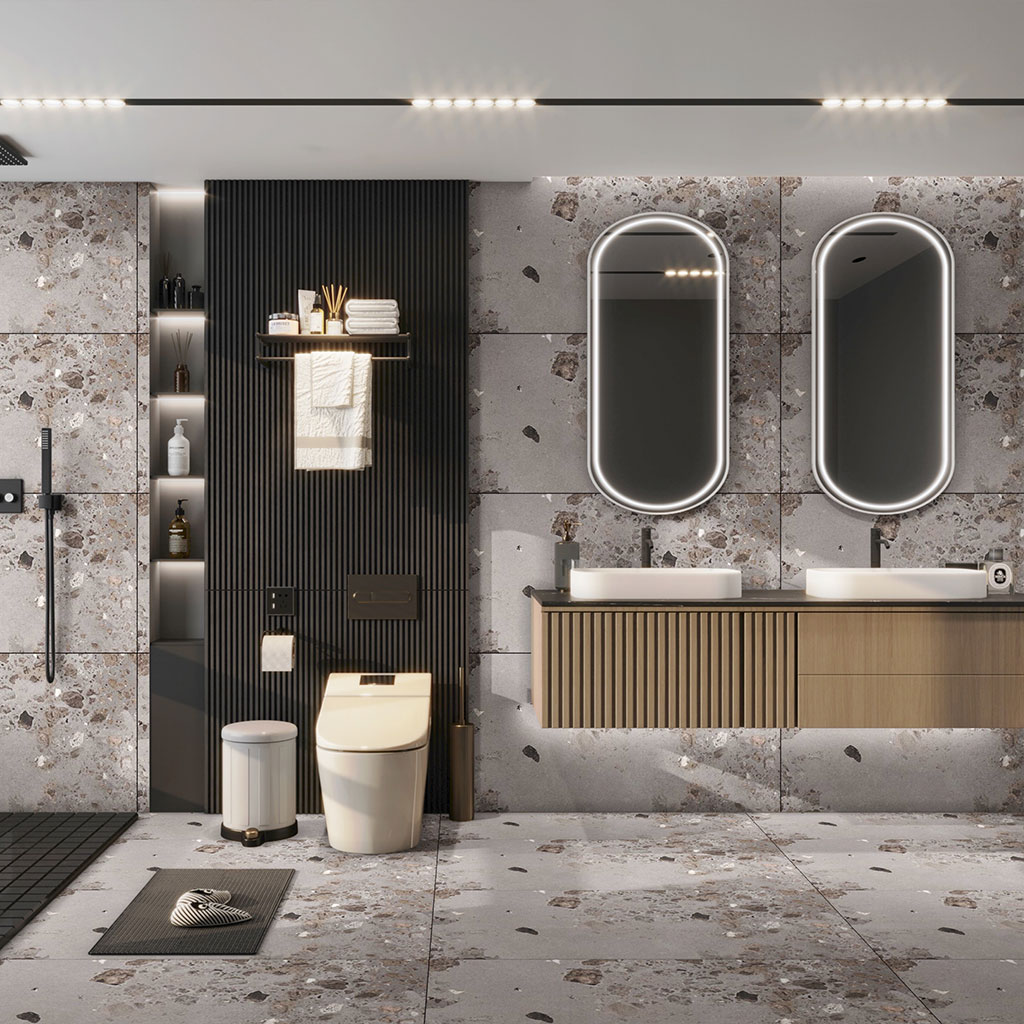 Flacko Steel features a contemporary terrazzo-inspired design set against a soft grey concrete backdrop. Measuring 1200mm x 600mm x 9mm, it delivers a bold architectural aesthetic suited to commercial interiors, hospitality spaces, and modern retail environments. Its large-format profile enhances visual continuity while offering a durable and specification-ready surface solution.