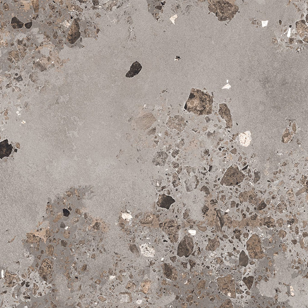 Industrial concrete grey base with terrazzo style stone fragments in warm and dark tones.