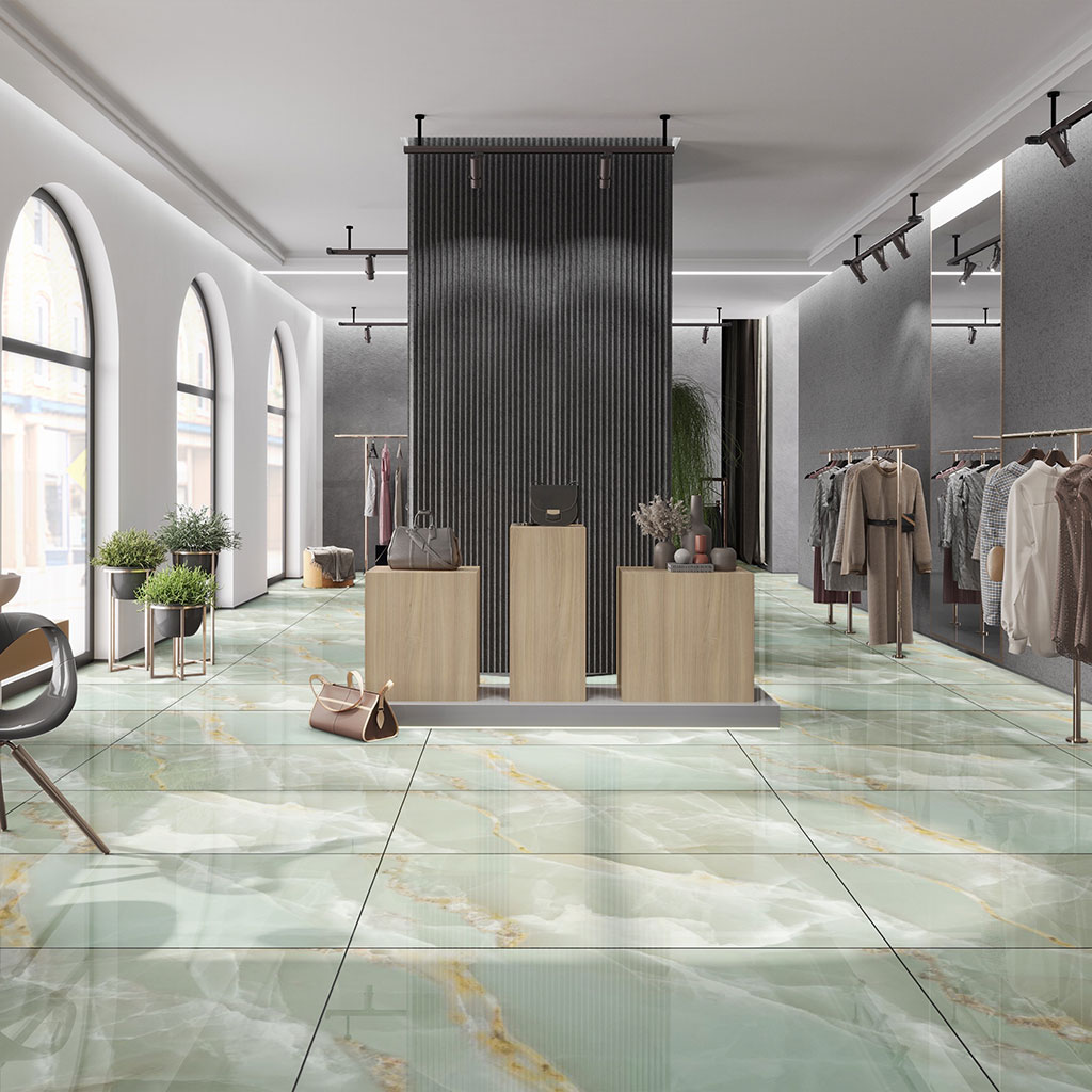 Infinity Blick Pitch delivers a distinctive green stone aesthetic with layered translucency and natural vein detailing. Measuring 1200mm x 600mm x 9mm, it provides a bold yet sophisticated solution for contemporary commercial spaces.