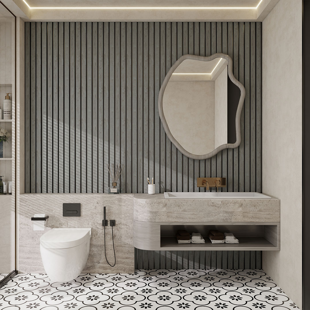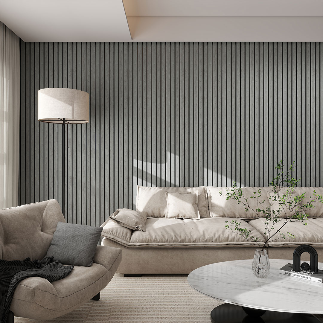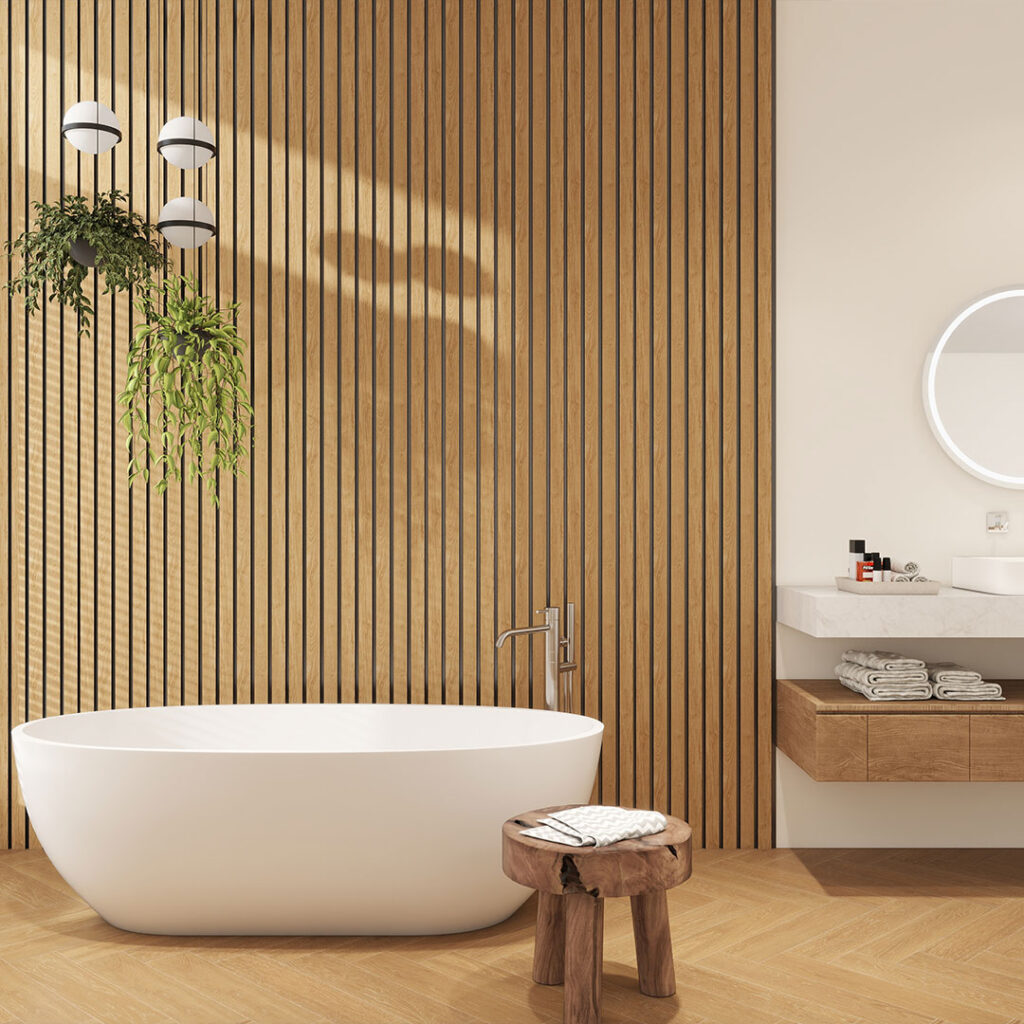 A waterproof 4 slat panel combining contemporary grey tones with natural wood character. Suitable for modern interior schemes that require durability and resistance to humidity.