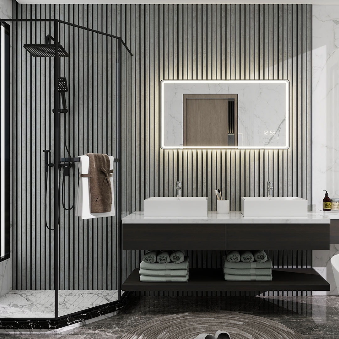 A waterproof 6 slat panel combining contemporary grey tones with natural wood character. Suitable for modern interior schemes that require durability and resistance to humidity.
