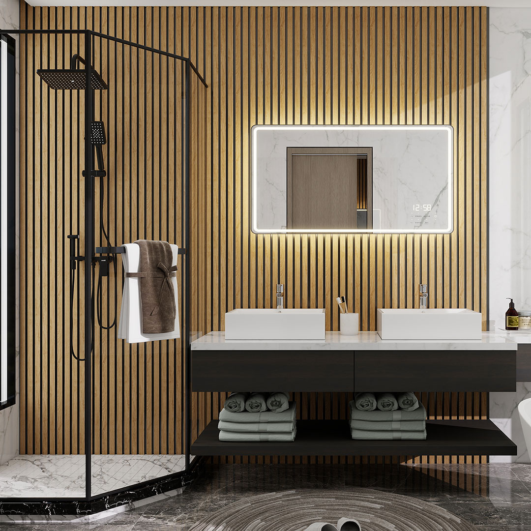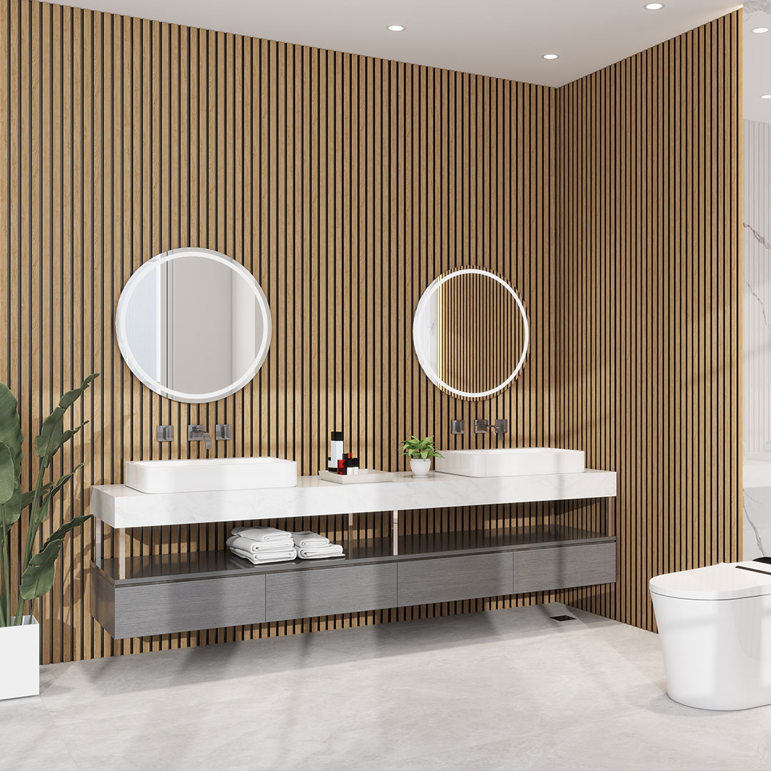 A waterproof 6 slat decorative panel featuring a clean oak inspired profile that delivers warmth and depth. Designed for commercial and residential interior applications where moisture resistance and durability are essential.