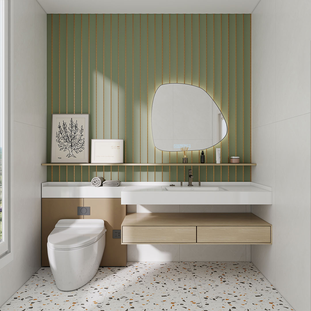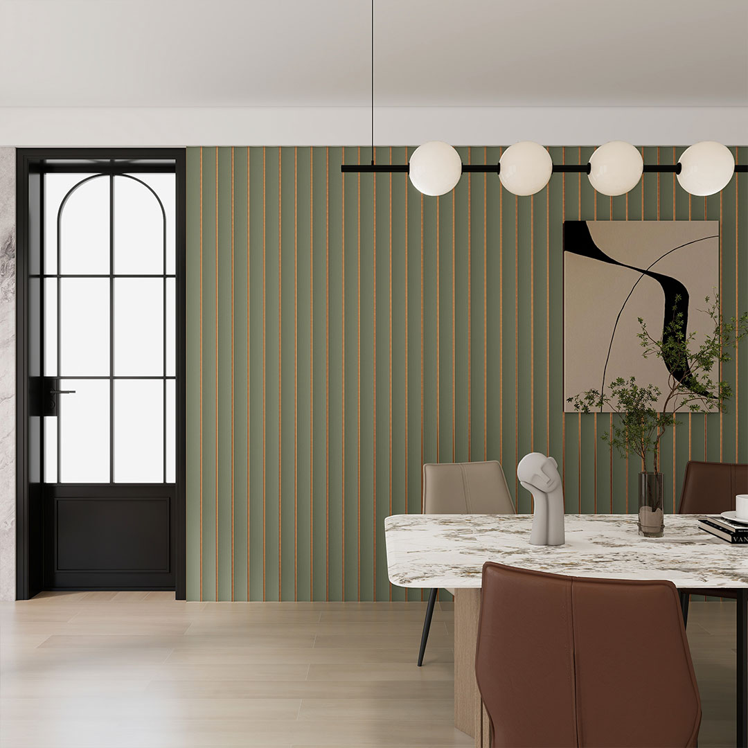 Waterproof curved panel offering subtle colour impact with elegant gold vertical accents. Suitable for design led installations requiring durability and moisture resistance.