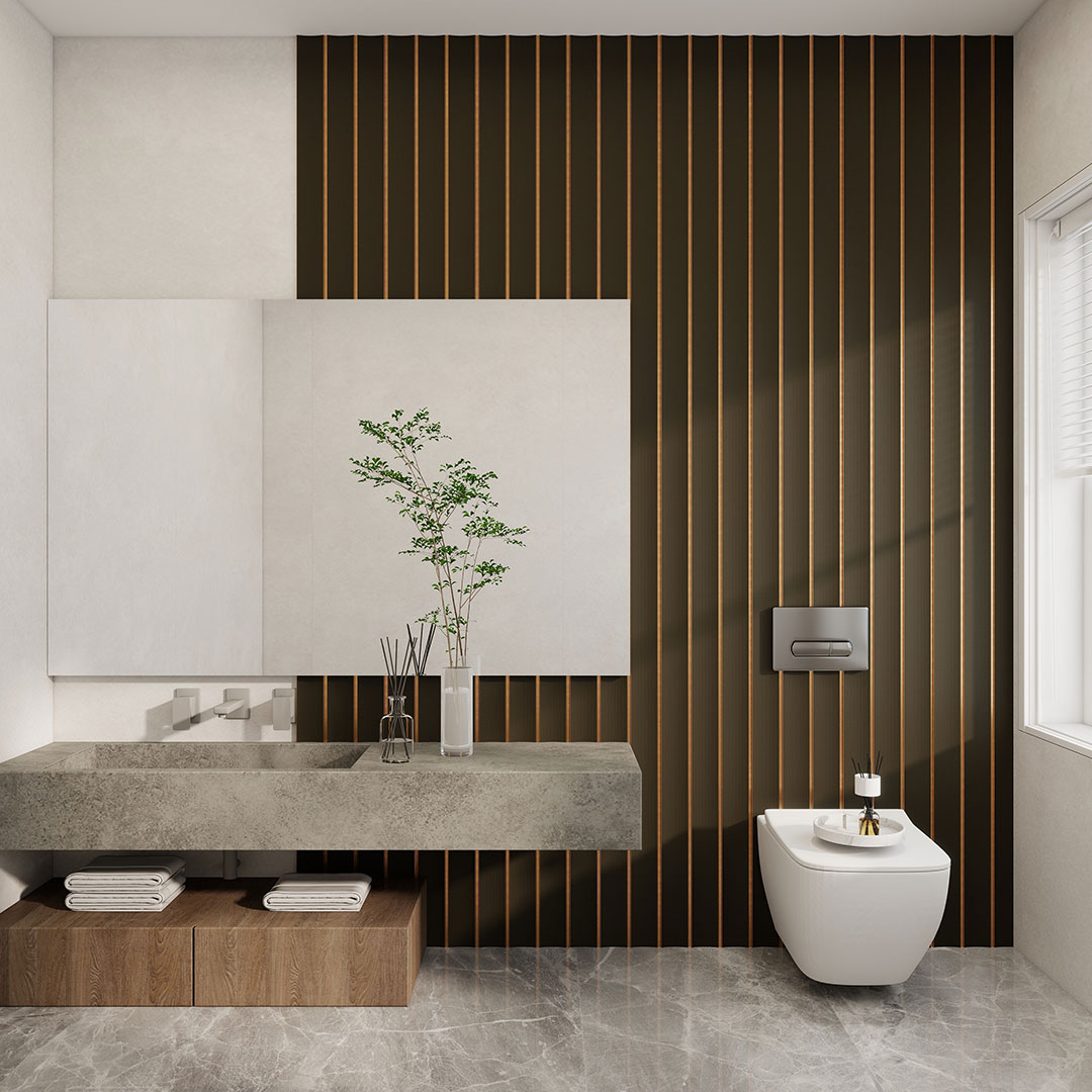Fully waterproof curved wall panel delivering contemporary neutral depth enhanced by slim gold inlays. Designed for feature walls in moisture exposed spaces.