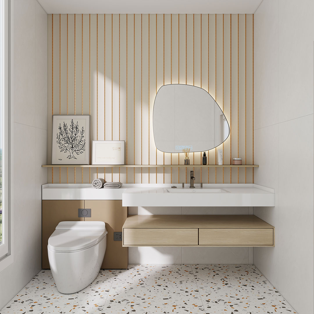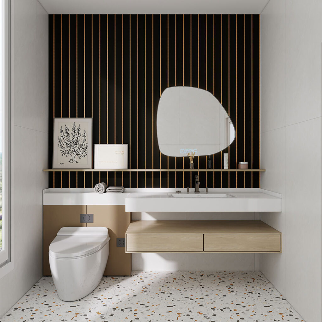 Fully waterproof curved wall panel designed with a refined gold accent between each slat to create clean vertical definition. Suitable for high moisture environments requiring durability with a premium architectural finish.