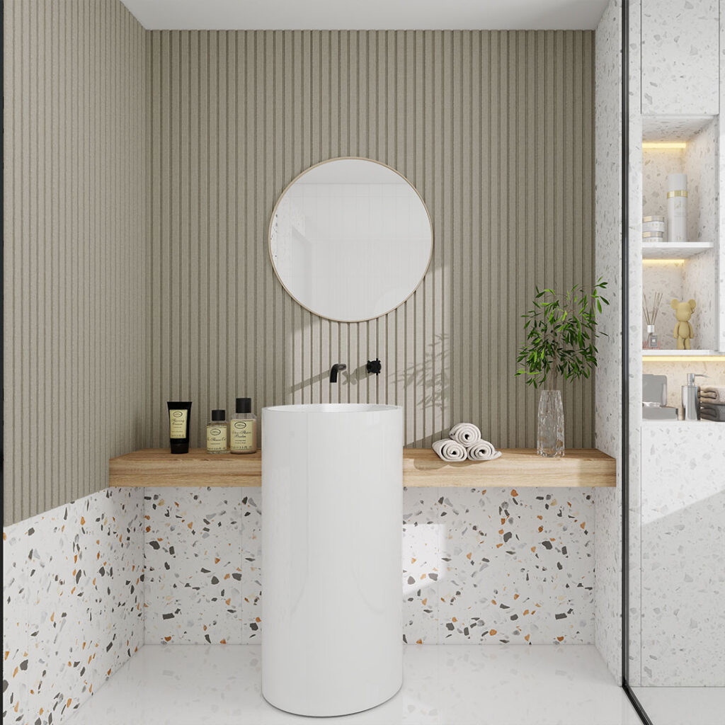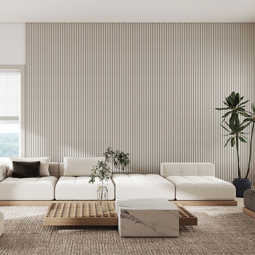 Fully waterproof woven slat panel featuring a subtle textile inspired texture for added surface depth. Designed to deliver refined vertical detail with enhanced tactility for residential and commercial interiors.
