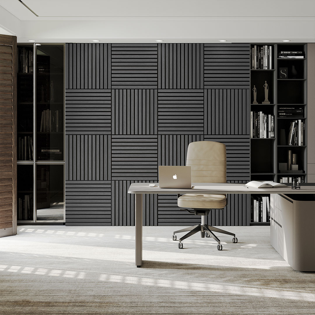 Ash Grey acoustic panels create a refined, minimalist wall solution for commercial interiors. Designed with evenly spaced vertical slats, these panels combine decorative structure with practical sound absorption for professional environments.