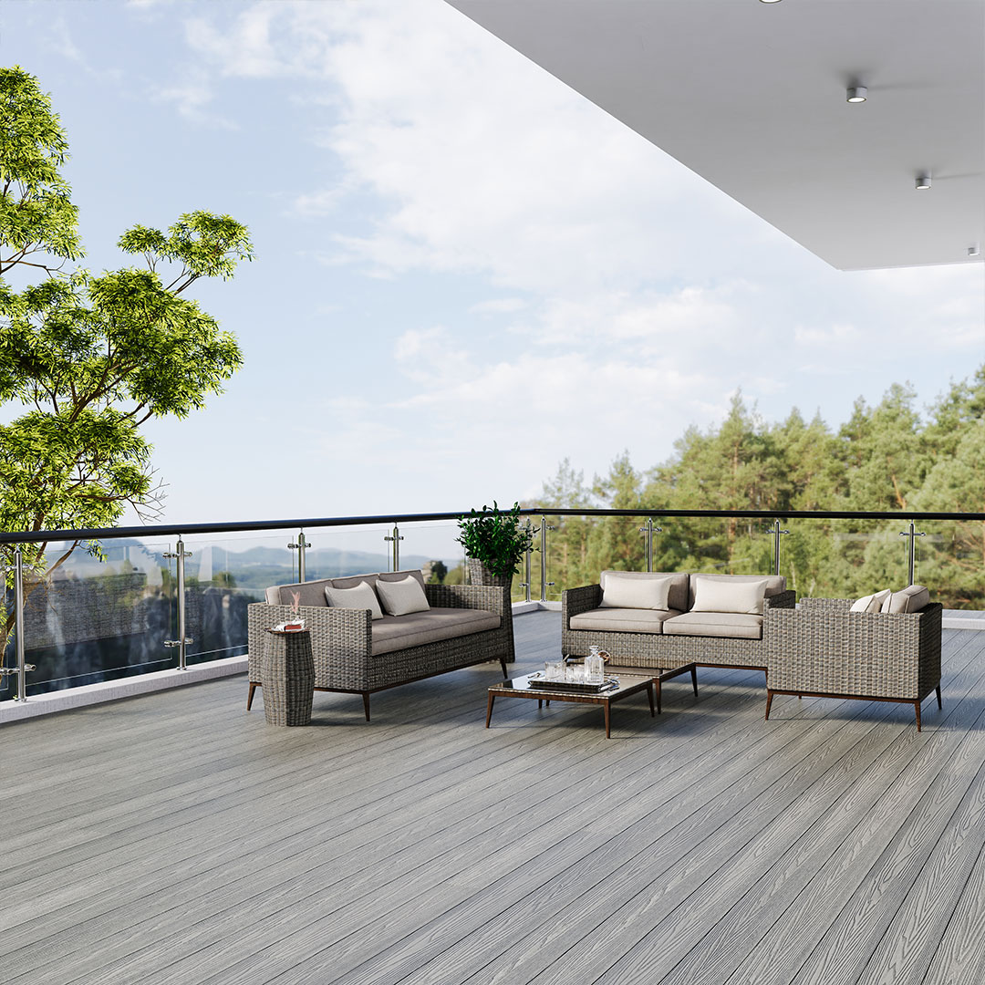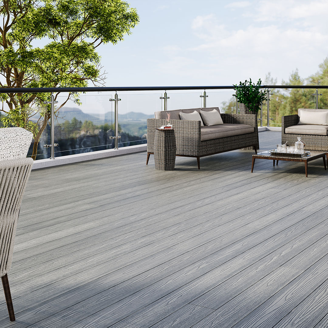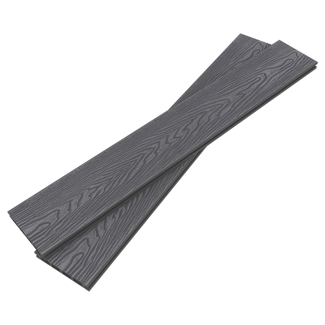 Grey Composite Decking combines practicality with refined design. The reversible board features a natural wood grain surface and a contemporary grooved option, allowing flexibility in finish. Supplied in 5 metre lengths to minimise visible joins, this board delivers smooth lines and efficient installation across wide spans. A durable, low maintenance solution designed for long term exterior performance.